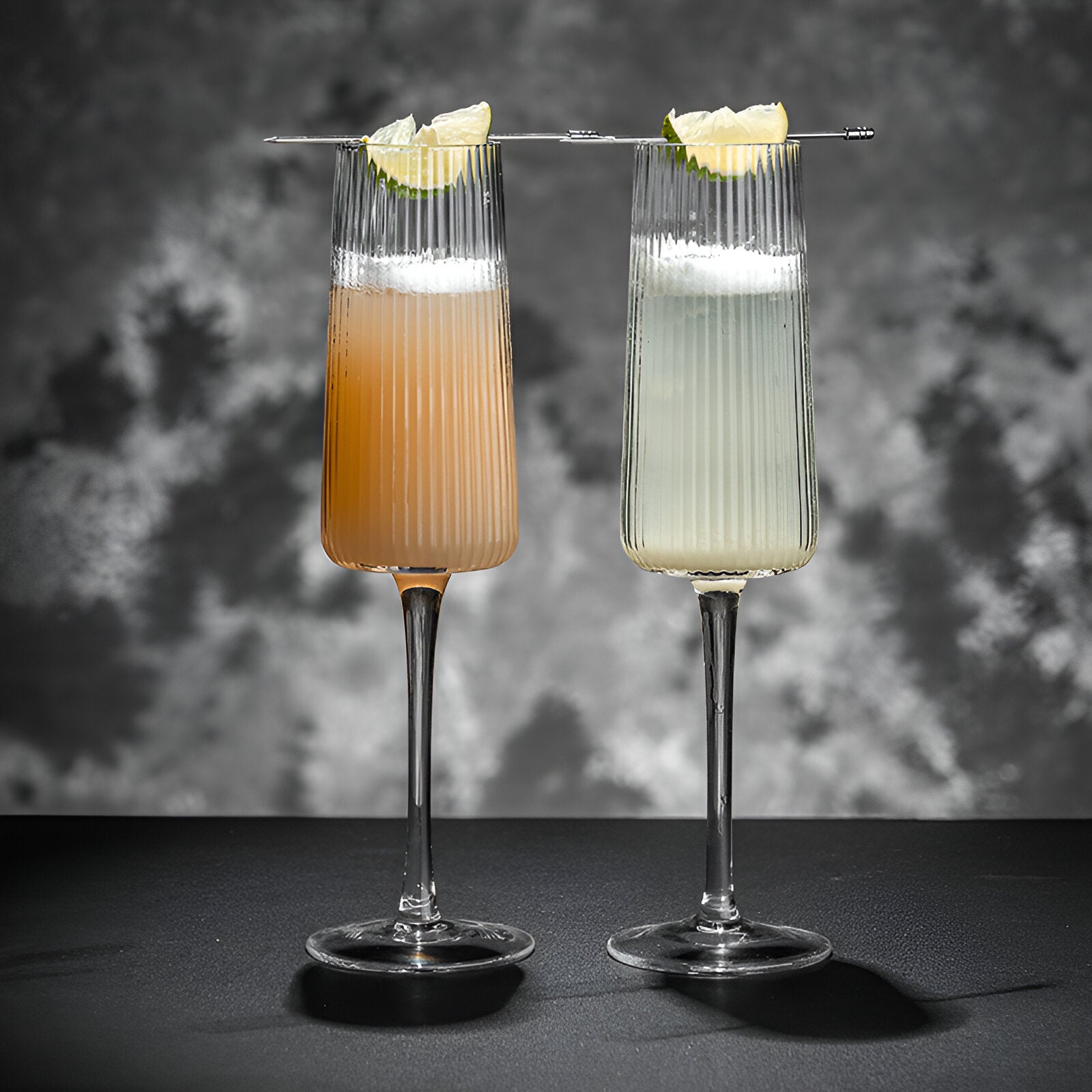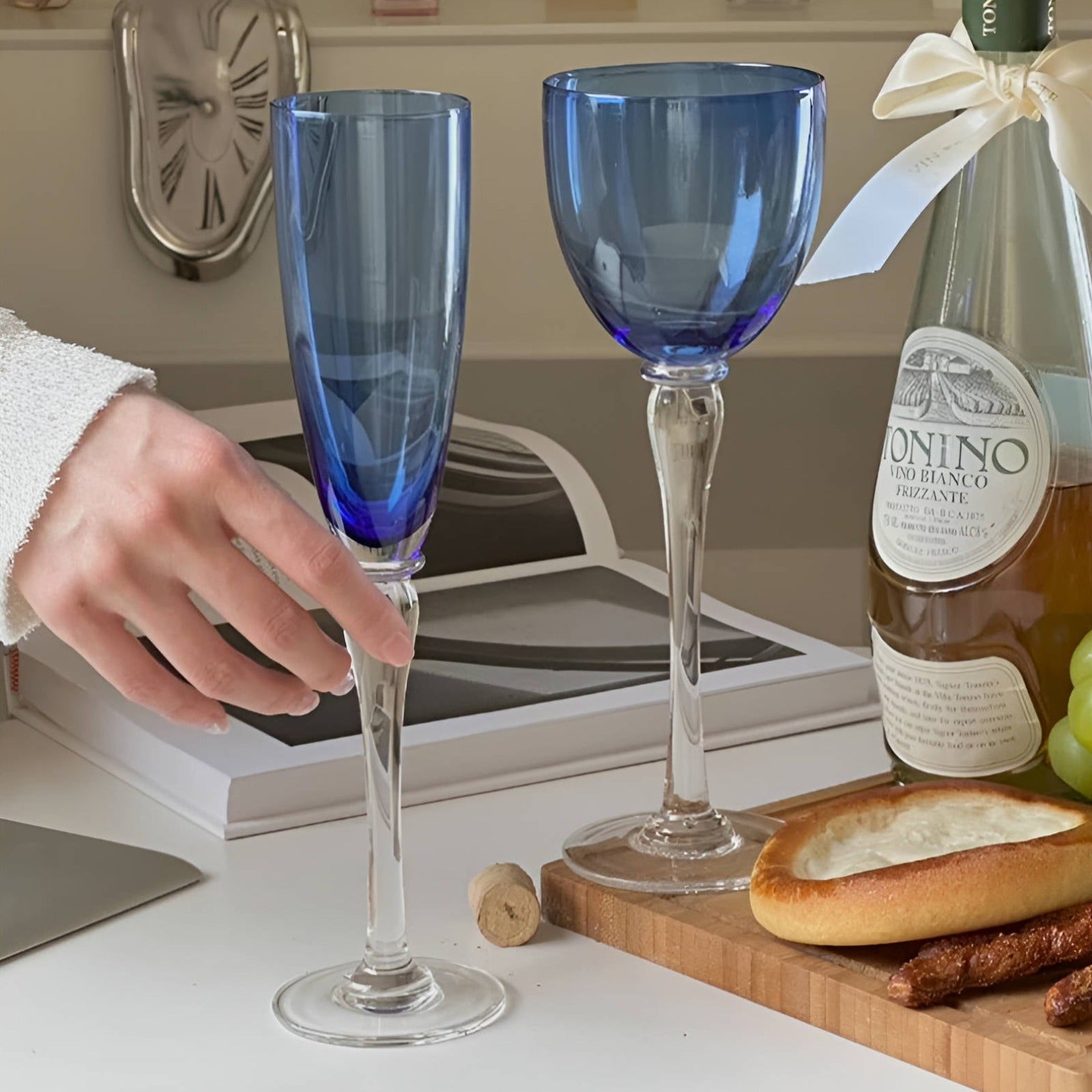 Laat je champagne momenten schitteren met ons unieke champagne glas, waarbij kleur is verwerkt in de stam. Dit glas brengt een modern gevoel van verfijning en een vleugje kleur aan tafel, waardoor het perfect is voor bijzondere gelegenheden en sprankelende vieringen.