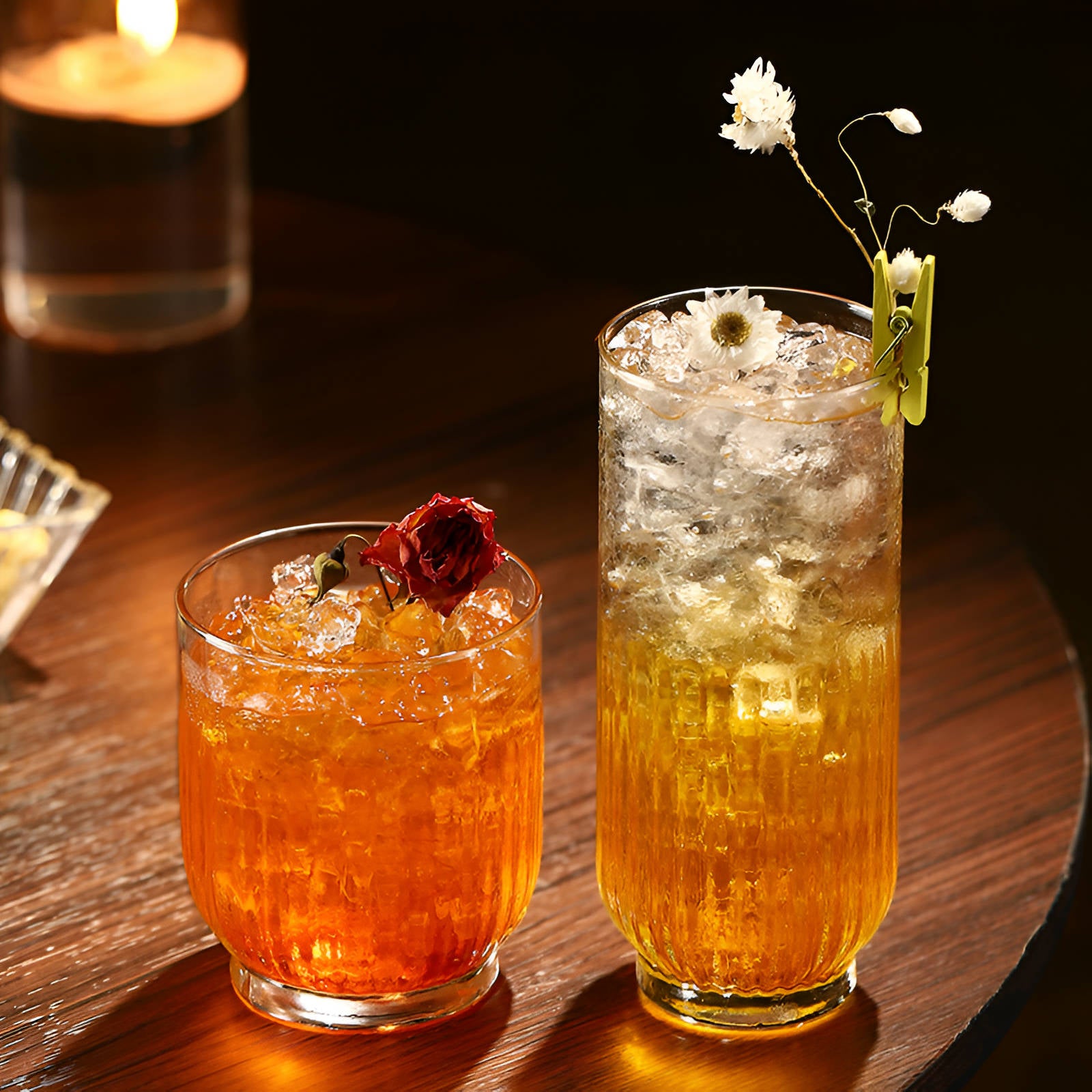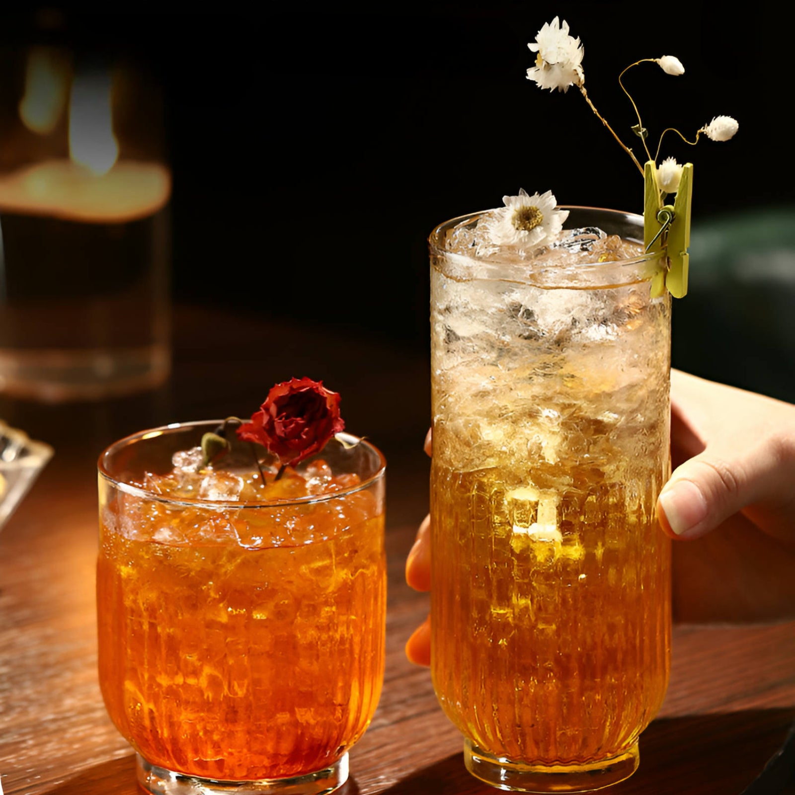 Het moderne geribbelde ontwerp van dit glas voegt een subtiel vleugje verfijning toe aan je drinkervaring. Het is niet alleen een prachtig stuk glaswerk, maar ook een statement in elegantie. Het is ontworpen om te schitteren, of je nu geniet van een verfijnde whisky, een met zorg bereide cocktail of een tropische drank.